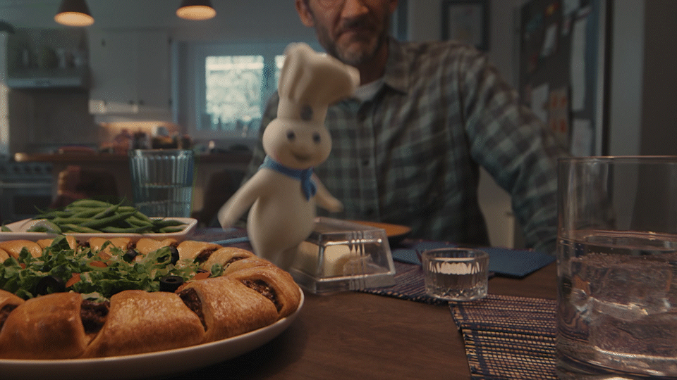 We shifted to more character-driven comedy spots, avoiding the typical "food porn" and "bite-and-smile" approach. These are animated spots in live-action homes, with the Doughboy interacting with family members and food.